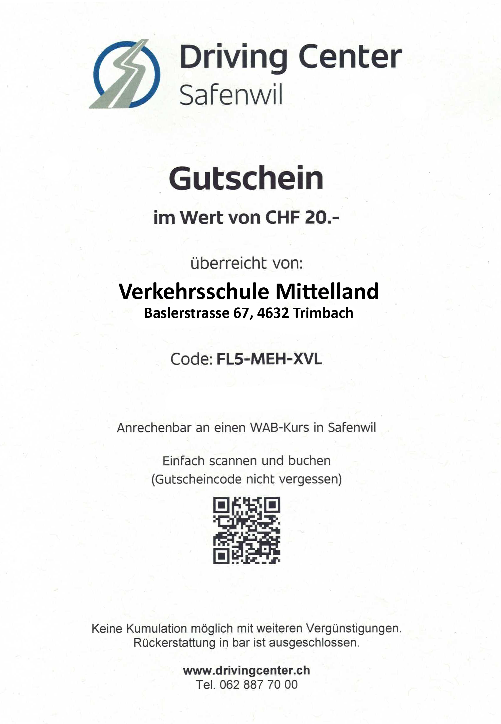Als Verkehrschule Mittelland Schülerinnen und Schüler erhälst du CHF 20 Rabatt auf alle WAB-Kurse bei Drivingcenter Safenwil.